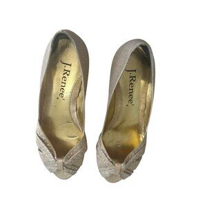 Elegant J RENEE metallic wedges in gold fabric with a chic kitten heel. Perfect for adding a touch of glamour to any outfit. Comfortable and stylish, these size 8 wedges are ideal for any special occasion. Back insoles still attached.