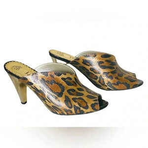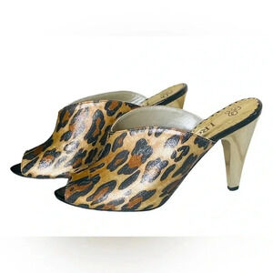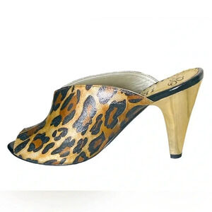Beautiful animal print open toe slip-on heels with goldtone heel that adds some sassy and classy look. They look classic!