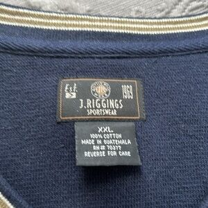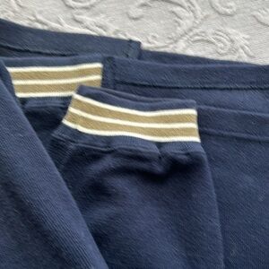 V-neck, long sleeve navy blue sweater, w/tan & white stripes at neck & sleeves. Side slits, 100% cotton, machine wash & dry. In very nice condition without any snags or holes!