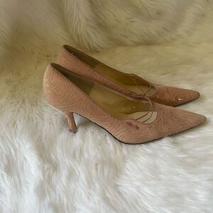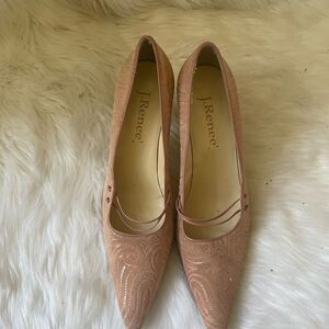 J Renée Diane leather suede blush pink iridescent design pointed toe slip on size 10M pre owned in good used signs of wear on the outer soles the pointed toe has wear mark no tear the inner lining has some peelings see all pictures any questions please message