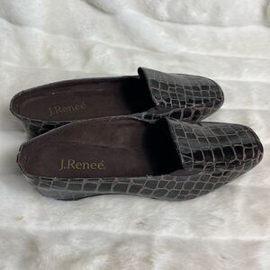 J Renée Edlyn Brown crocs prints wedge mules with sides elastic size 13WW pre owned in good used condition normal wear see all pictures any questions please message.