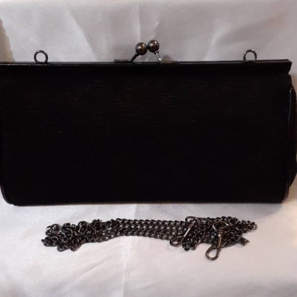 Beautiful black pleated fabric, trimmed with patient leather, easy to wipe clean. Comes with removable chain strap. Measure approx. 5.5 x 10.5 inches. Used twice. In new condition. Matches the J Rene Elvira shoes