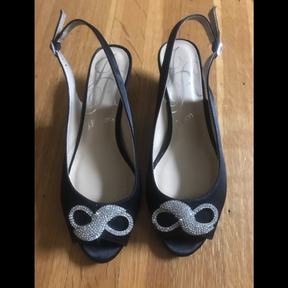 J. Reneé black satin sling back kitten heel shoes with rhinestone toe adornments. Super sweet. Heel is a wider/more stable heel 2” high. Worn once, near perfect condition.
