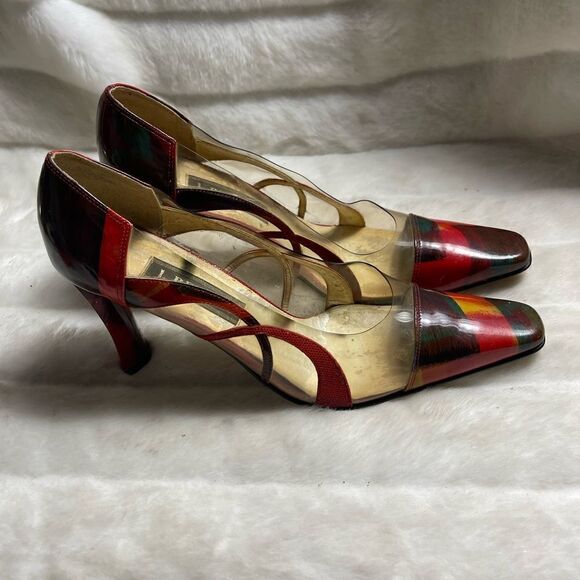 J Renée clear PVC and patent marble multi color slip on pumps size 12M pre owned in good used condition some peelings on the inner soles see all pictures any questions please message.