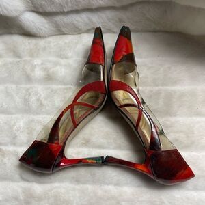 J Renée clear PVC and patent marble multi color slip on pumps size 12M pre owned in good used condition some peelings on the inner soles see all pictures any questions please message.