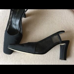 Very dressy square toe shoes with grosgrain vamp and toe. Sides are mesh. Sling back strap has elastic. Heel height is 3 inches. Very good condition.