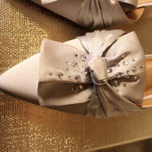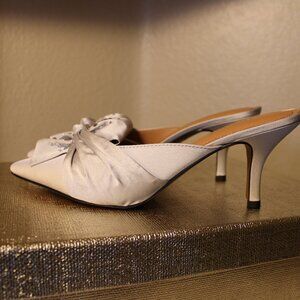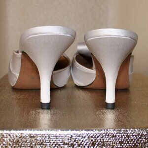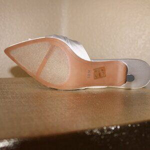 Beautiful satin shoe. New in Box The color is steel grey, but it looks like a silvery champagne color to me. It is such a pretty shoe!