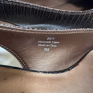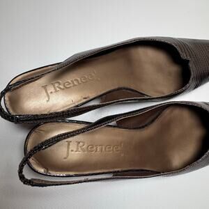 These shoes are a pair of slingback heels from the brand J. Renee. They feature a square toe design with a textured, lizard-print finish in a metallic brown or bronze tone. The V-shaped notch at the front adds a stylish touch, and the insoles have a slight sheen, likely for both aesthetic and comfort purpose. 2inch Heel