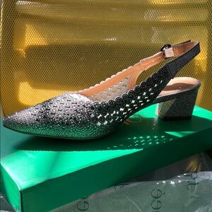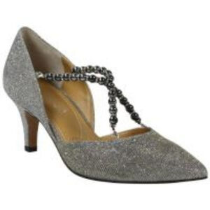Chic pointy toe mid heel pump with two part dance glitter fabric upper. Versatile wearable style with removable beaded stretch criss-cross straps. Wear to any day to evening event. The Zayna features a memory foam insole for added cushion and comfort. Make a style statement for any occasion with J. Renee'.