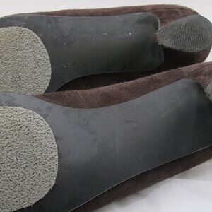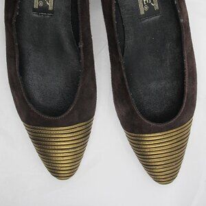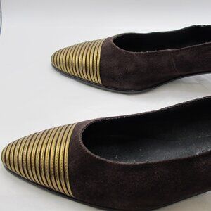 J Renee 1.5 inch brown suede heels with gold leather stripes on toes with no apparent defects. There is little to no wear on the heels and exposed soles, so barely worn or new. **Sole grip was added – this was a common practice of Mom on buying heels.**