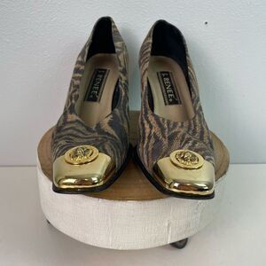 These stylish heels feature a unique gold and brown tiger pattern, complemented by a decorative gold-toned metal accent on the toe. The short, chunky heel and rounded toe design offer a blend of comfort and elegance, making them a versatile addition to any wardrobe.