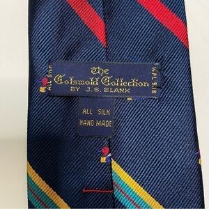 Beautiful tie has navy background with duck motif and diagonal stripes in red, green and gold colors. Handmade and in excellent condition.