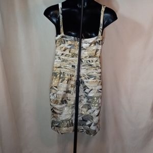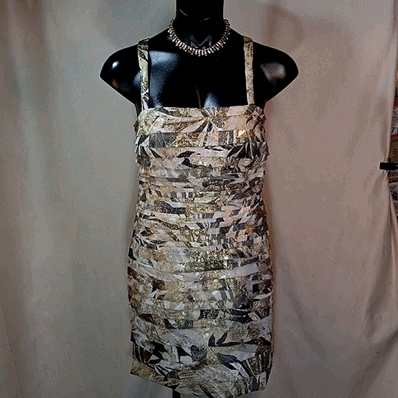 Beautiful Gold & Earth Tones w/ Real Authentic Gold Infused In Matireals Summer Dress w/ Shoulder Straps & Zipper Back Perfect For Any Special Occasion In Perfect Condition.
