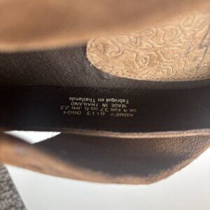 Elevate your style with these beautiful J. Shoes "Abbey" suede heels. Crafted in a rich brown suede, these shoes feature a unique knot detail across the vamp for a touch of bohemian elegance. The low kitten heel provides comfortable height, making them perfect for both day and night wear. The insoles and outsoles feature an intricate floral and scroll pattern, adding to the artisanal quality of the brand. Made in Thailand.