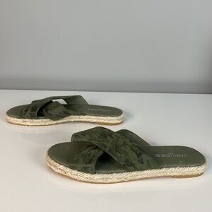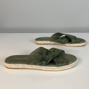Stylish olive camo sandals by J Slides. Comfortable and chic for everyday wear.