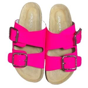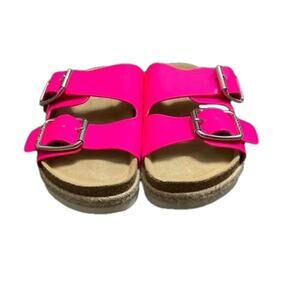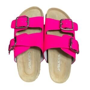 Step into spring in the neon pink Leighton Sandal by J/Slides. Designed for comfort and featuring a braided jute detail and double buckle.