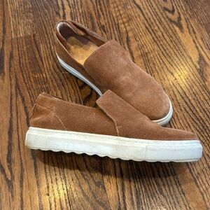 J. Slides caramel suede slip on loafers padded heel “tongue”. White sidewalls with light wear - see pics. Elastic band hidden under forefoot. Suede in great condition. Size 8. Nonsmoking home.