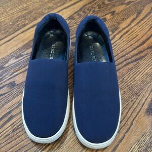 J Slides navy thick scuba fabric white sidewall slip on  loafers. Padded heel. Size 9. Light wear. Nonsmoking home.