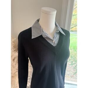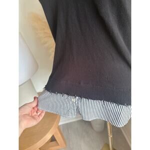 Tags: J. Society sweater XS, black cotton V-neck sweater, layered stripe collar sweater, frayed hem knitwear, women’s boutique sweater, casual preppy sweater, lightweight layering sweater, modern minimalist knit, chic everyday pullover, versatile black sweater