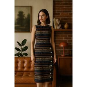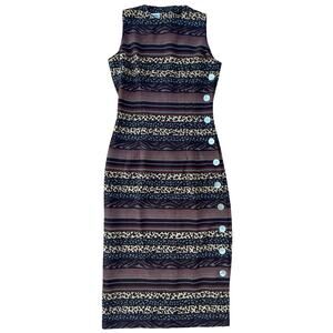 * vintage J. Stevens dress, 80s 90s midi dress, abstract print dress, button detail dress, pearlescent buttons, retro minimalist dress, brown patterned dress, sleeveless sheath dress, classic vintage