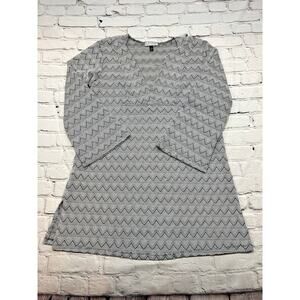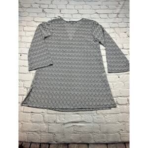 This is a black and white mesh beach cover up by J Valdi in a zigzag chevron print, size medium. B-neck with flared, cropped sleeves. Very breathable, size medium. Pre-owned, but in excellent condition with no visible flaws. Missing content tag, so unsure of fabric content.