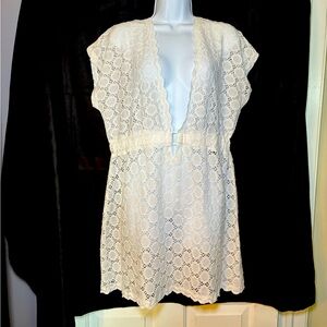 J Valdi Woman’s White Lace Swim Coverup Size XL Scalloped Bottom Deep V Neck