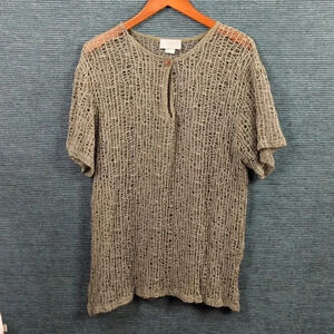 It is an olive green, and has one button at the neckline that has leaves etched in it.