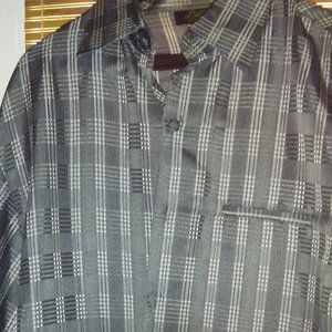 Grey. Top is a Large. Pants are 34/32. 100% Polyester. Geometric Pattern.