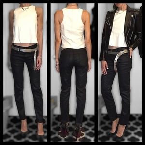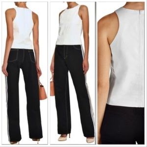 An ultra cool high-neck sleeveless top in clean white leather. Raw hem. Back zip closure.