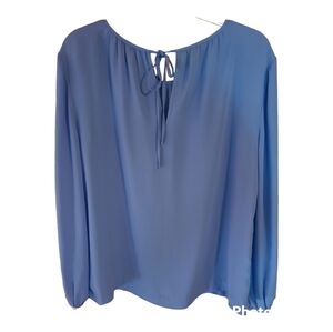 Beautiful blue blouse with a tie in back and small button on cuff of sleeves. Approx 21" pit to pit, 24.5" shoulder to hem.