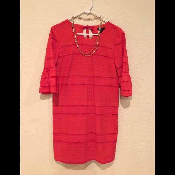 Beautiful J Crew Red Shift Dress Flutter sleeves spring 2017 collection. The dress has eyelet detail throughout and it has a zipper up the back and a tie at the back of the neck. The dress has only been worn once or twice so it is in an excellent condition.