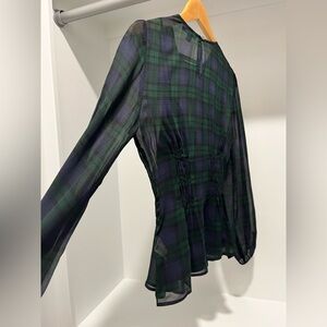 J crew Chiffon shirred-waist top in Black Watch tartan in Cooper Green Blue sz 0