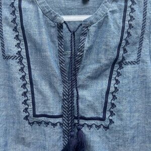 J crew Mercantile peasant top XS chambray embroidered blue denim tassel boho
