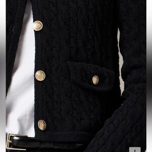 Somewhere between a jacket and a cardigan, crafted from cozy, naturally knotted cotton bouclé in a cable-knit stitch. Plus, this version comes with all the classic details, like gold crest buttons down the front and flap pockets.
