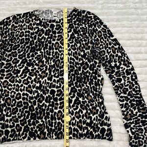 This is a preowned J crew Women Leopard Pattern Sweater Size Medium. It is in fair preowned condition. Please look at the pictures for the condition of the sweater. There is some white stain on the sweater.