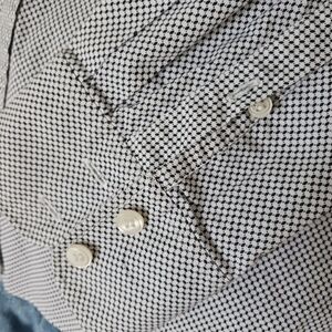 black and white button down. has a little stretch to it. feels really great on the skin. you can dress up or wear with a pair of jeans 😍 the size is ripped off but I'd say it fits like a s-m more of a medium