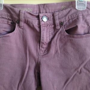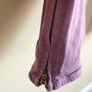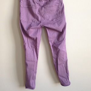Lavender colored ankle toothpick! Sits at low hips and is skinny around legs! It also has zippers on the ankles. Jeans will hit at your ankle because they are cropped. Very cute rolled up and with a boot for fall or flat and a cozy sweater! Runs big and will stretch over time. Let me know if you have questions. Worn only a few times.