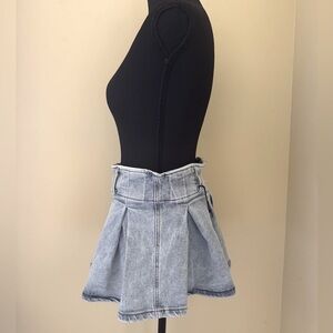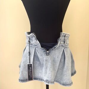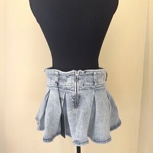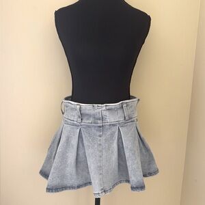 Chic J for Justify pleated mini skort skirt in light wash blue new with tags. Features an outer layer of jean fabric skirt, while having a pair of compression shorts built in underneath for added coverage and ease of movement. Belt loops and back zipper. Approximate flat measurements; length 11”, waist 14”.