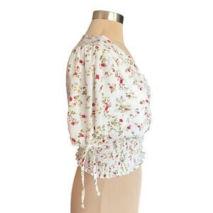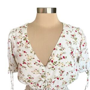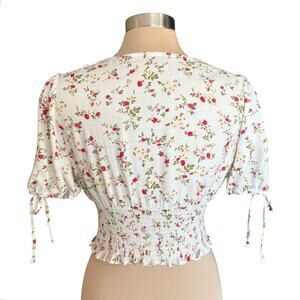J for Justify Ditsy Floral Crop Top Smocked Waist LRG Milkmaid Coquette Romantic. Puff sleeves with bows. V-neck. Covered button closure. In excellent preowned condition.