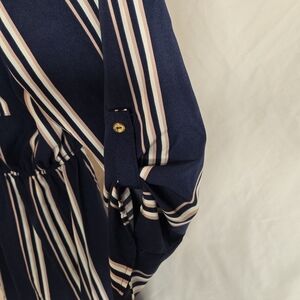 Chic and nautical-inspired, this J for Justify navy striped dress features a flattering elastic waist, front zipper closure, and roll-tab sleeves for a versatile look. The vertical stripes elongate the silhouette, while the soft, lightweight fabric makes it perfect for everyday wear or casual outings. Details: Brand: J for Justify Size: Small Color: Navy with white and blush stripes Features: Zip front, roll-tab sleeves, elastic waist, chest pockets Condition: Excellent pre-owned condition Style it with: white sneakers for a casual day look or wedges and gold accessories for a dressier vibe.