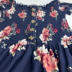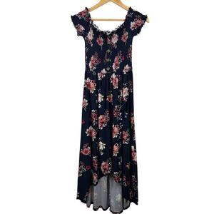 J for Justify Navy Blue Pink Floral SMOCKED Off the Shoulder High Low Dress Small
