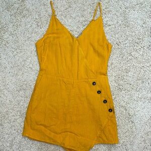 J for Justify Goldenrod Amber colorful Surplice V-Neck Side Button Casual Romper Skort (skirt/shorts). Textured cotton Stripe Skort. Elastic waistband in back. Adjustable spaghetti straps, v-neckline, functional side buttons and Pockets!! Modesty Snap at neckline. Fully Lined. Approximate measurements in photos. Excellent condition. Machine Washable.