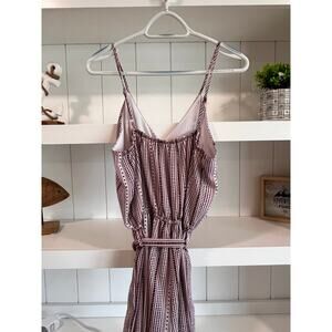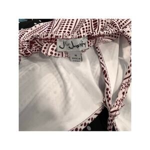 This J for Justify sleeveless jumpsuit in size Medium features a maroon geometric stripe pattern on a white background. Designed with a deep V-neckline, belted waist, and flowy wide-leg silhouette for a flattering fit. The front snap button closure is present but slightly loose, which may need reinforcement. Otherwise in good pre-owned condition.