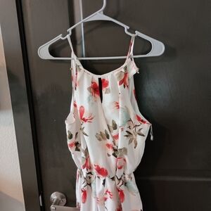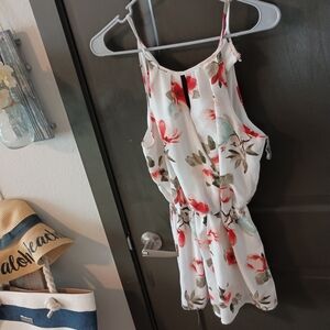 Stylish romper with vibrant floral design. Features bold red and green on a white background.