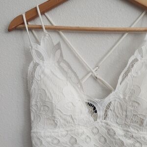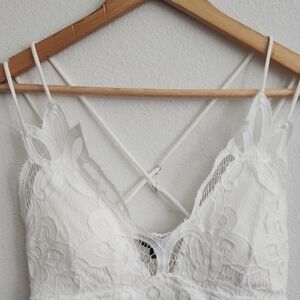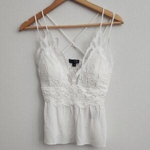 Chic white camisole with lace details. Features tiered ruffles and thin straps. Ideal for a fashionable outfit. Adella Cami Dupe.