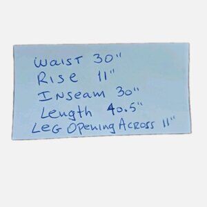 Measurements: waist 30", rise 11", inseam 30", length 40.5", leg opening across 11"