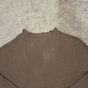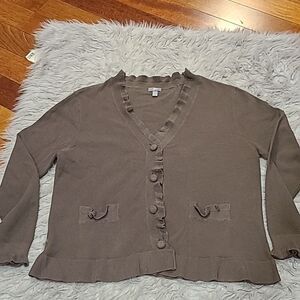 J jill womens brown cotton stretch button front cardigan with ruffles size large, small spots of fading on top back as shown in picture