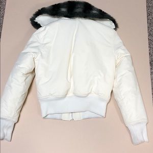 J lo/ Jennifer Lopez winter coat in white and faux fur around neck. Slight normal wear- see pictures for minor/ normal wear for a white coat. Reflected in price. Pet free smoke free home.