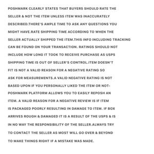 -I PLACE MUCH IMPORTANCE ON BUYERS WHO HAVE PREVIOUSLY PURCHASED FROM ANY BUYER ON POSHMARK AND FOLLOWED PROPER PROTOCOL-ACCEPTED PURCHASE IN A TIMELY MANNER, LEFT A STAR RATING & A LEFT AN OPTIONAL KIND COMMENT.REVIEW MY NUMEROUS FEEDBACK RECEIVED FROM MY VALUED CUSTOMERS