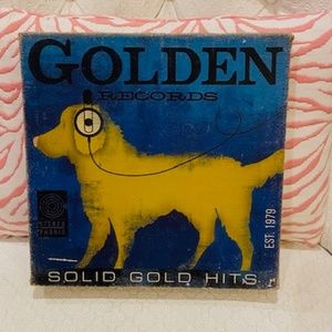 -Gemini Studio Art art and decor by Stephen Fowler of Mooresville, North Carolina. Golden Records, Solid Gold Hits features Golden Retriever wearing headphones. Gallery wrap all art sides are wrapped in burlap. This burlap wall art is a free standing design that can also be displayed on a wall. This art piece is fabulous-no frame needed, purposely distressed, and all 4 sides are wrapped in burlap. I love this piece created in 2011 and the inspiration behind it-see last photo. I also have a Rottweiler available listed separately.